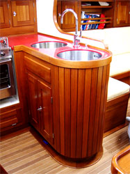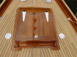 Ein Beispiel ihrer Bootsbaukunst ist die Befestigung der Beschläge für Vor- und Achterstag, die hochglänzend mitten aus den lamellierten Steven hervorragen. Wegen leidvoller Erfahrungen des Eigners soll kein einziger Bolzen durch die Außenhaut gehen.
